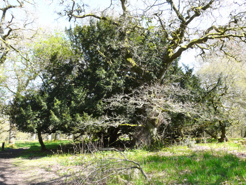 In the woodland there is a female phoenix yew with noticeably dark foliage and very long needles (at the time of visit in May 2024) in an area of Victorian planting. Deeper into the woodland is a female layering yew with a sizeable trunk and a canopy circumference of approximately 80 metres. Next to the chapel close to the castle is another yew probably over 300 years old.