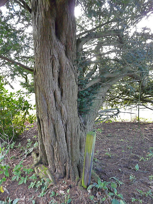 There are yews elsewhere here. One stands at the entrance of the driveway and a close growing pair where the drive bends to access the house. Another stands by the gable of the house in a small garden. All are thought to be part of the modernisation in 1904 making them over 200 years old.