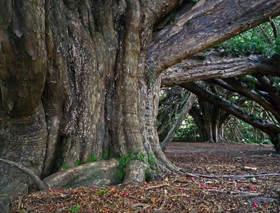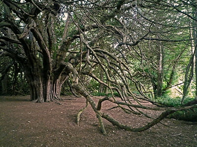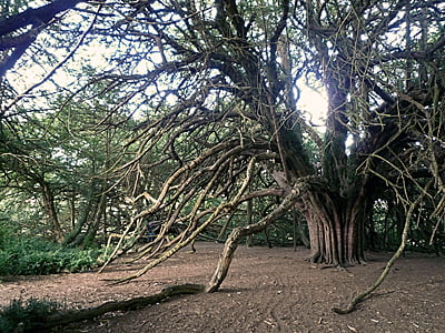 The Great Yew of Ormiston stands in what once were the grounds of Ormiston Hall, built in the mid – eighteenth century two miles south of Ormiston for John Cockburn. It is said that in the mid- sixteenth century John Knox may have preached under this yew, which he would have been aware of by previously being a tutor to a child of the master of the house. It was here in 1545 that Knox’s close companion in the Scottish Reformation, George Wishart, was captured. At that time, around five hundred years ago, this yew was a well-known local landmark. Hence it is thought that today this huge, layered yew tree with a magnificent, fluted trunk of 592 cm girth at 100cm high (SYTHI 2017) could well be around a thousand years old. However, there are two other major yew stems to the west and east of the main trunk which also constitute the overall canopy spread and it is not known whether there they are layering, i.e. what we see is all one yew, or are younger seedlings with different DNA and only testing could resolve that question. Usually this yew is described as female but that is not quite so as one of 22 stems found layering from the main trunk is male.